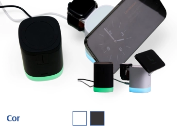 Carregador 3 em 1? A nossa base de carregamento é diferenciada, já que possui indução para relógio, fones e celular, e você pode usá-los todos ao mesmo tempo, basta que o celular e demais dispositivos tenham a tecnologia QI. O LED RGB possui 2 modos, luz branca e vermelho, verde e azul se alternando. Feita em plástico, a base não armazena energia, portanto, precisa estar conectada ao cabo tipo-C q