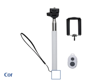 Bastão de selfie alumínio com detalhe emborrachado colorido. Possui suporte plástico, controle plástico, funciona com uma bateria lithium CR2032(não inclusa) . Suporte ajusta até 8,4cm de largura para encaixar celular, bastão estende até 88,2 cm de comprimento. Válvula lateral para ajuste de posicionamento e válvula central para apertar o suporte.