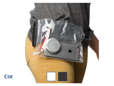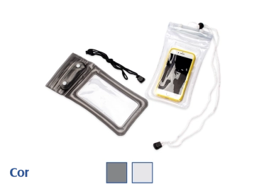 Capa impermeável com classificação IPX8 para smartphones, feita em PVC resistente, com área sensível ao toque que permite o uso pleno do aparelho. Possui vedação hermética e fechamento por botões de plástico. Acompanha cordão ajustável em nylon.