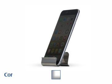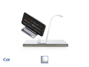 Porta celular inox brilhante espelhado. Base com parte inferior de borracha anti-deslizante.