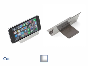 Porta celular brilhante em inox, chapa metálica encurvada e suporte traseiro soldado para dar apoio à peça ficar ereta.