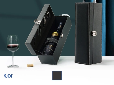 Kit vinho 4 peças em maleta de couro sintético. Contém saca-rolhas metálico, bico condutor com tampa, cortador de lacre e wine colar. Maleta com alça, trava de segurança e parte interna revestida de veludo com área de acomodação para garrafa.