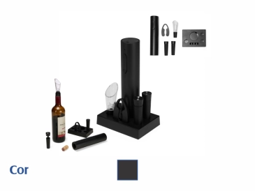 Kit vinho com cinco peças, incluindo: saca-rolhas em plástico e aço carbono com acionamento por botões alimentado por quatro pilhas AA (não inclusas), bico dosador e rolha em plástico e borracha TPR, cortador de lacre e base em plástico.