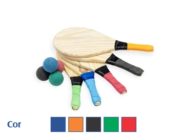 Kit frescobol com embalagem de malha plástica. Contém 2 raquetes de madeira com pegador de revestimento EVA e bolinha emborrachada.