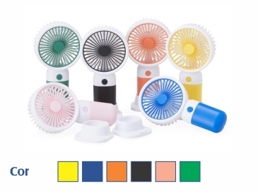 Mini ventilador plástico recarregável com base removível e botão de acionamento. Acompanha cabo usb.