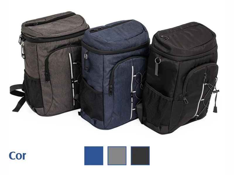 Conta ainda com compartimentos adicionais para frutas e lanches, bolsos frontais com zíper (um com faixa refletiva e elástico ajustável), bolsos laterais em tela e chaveiro abridor de garrafas para mais praticidade.