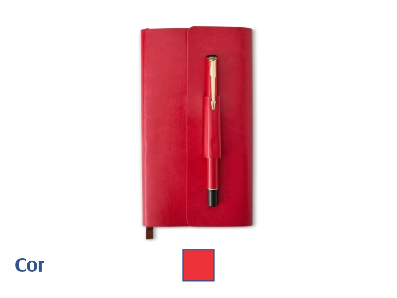 Com aproximadamente 112 folhas amarelas pautadas e feito em couro sintético, o kit vem acompanhado de uma caneta metálica com carga esferográfica preta e um porta-caneta que também serve como fecho para o kit. Além disso, conta com um compartimento na parte de trás para cartões ou documentos. Prático e funcional na hora de organizar.
