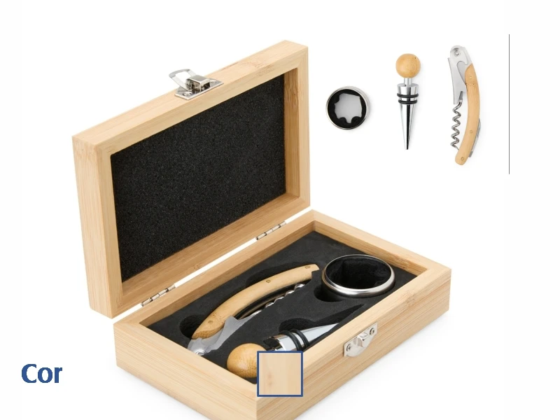 Acompanha um saca-rolhas metálico com acabamento em bambu, que possui lâmina de corte e abridor de garrafa, uma tampa de bico com detalhe em bambu e silicone, e um wine collar. A caixa de bambu tem um design sofisticado e rústico, e contém ainda um berço de espuma interno, garantindo a proteção dos itens.